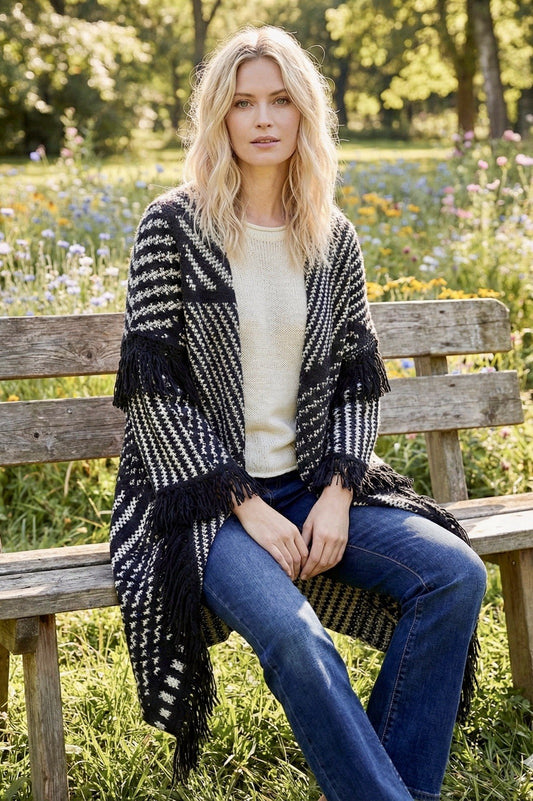 Johnny Was L Large Black & White Hoodie Duster Kimono Sweater Jacket Coat Wrap