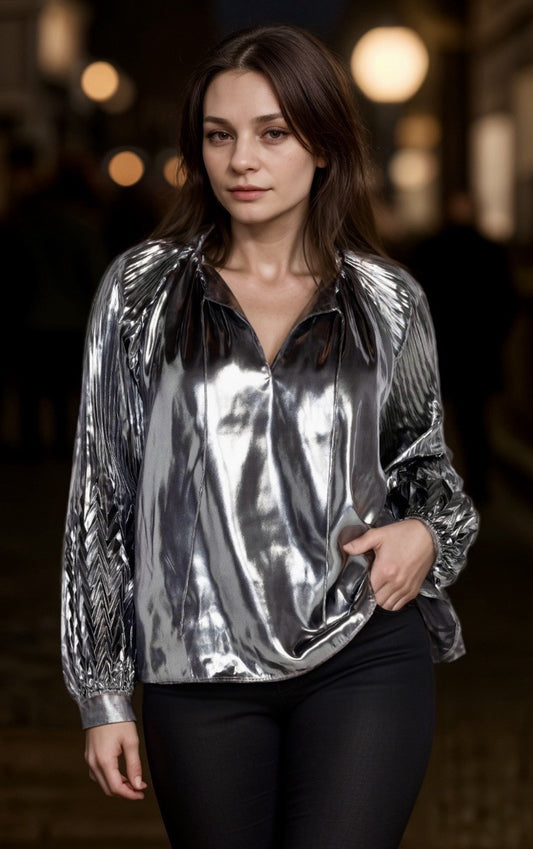 Johnny Was 3X Plus Shiny Silver Party Top Peasant Blouse Tunic Shirt