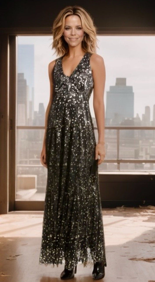 Johnny Was Sz 12 Black Sequin Party Dress Luxe Cocktail Mesh Slip Sequins