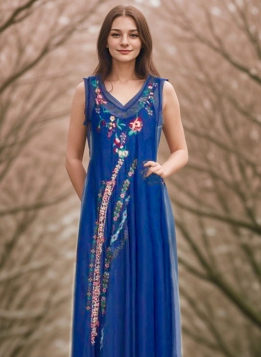 Johnny Was XXL Plus Blue Embroidered Mesh Maxi Dress & Slip Sleeveless