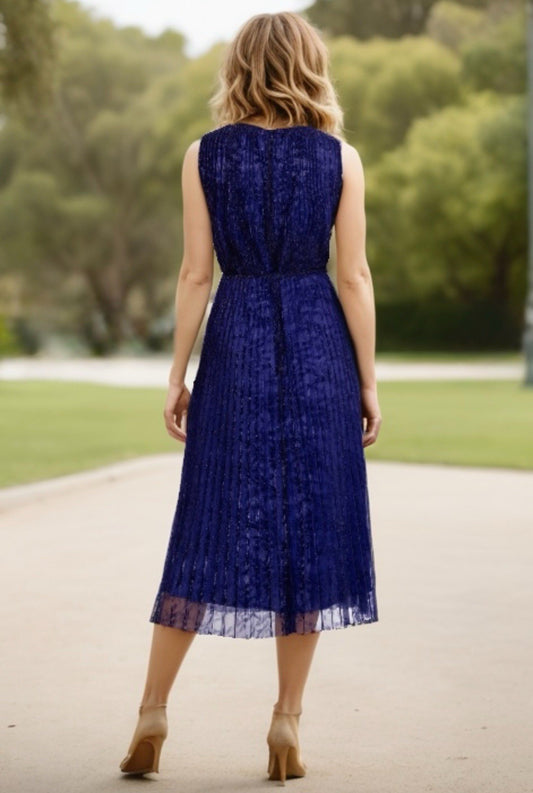 Johnny Was Sz 14 Blue Pleated Mesh Cocktail Party Dress Sleeveless V Neck