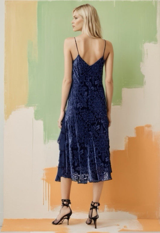 Johnny Was XL Midnight Blue Burnout Velvet Ruffled Slip Dress Midi Party LUXE