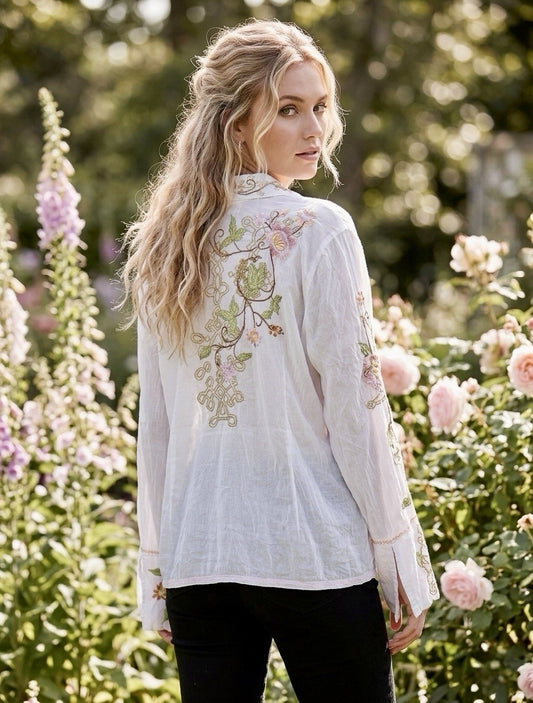 Johnny Was XL White Button Up Blouse Top Pink Floral Bird Embroidered Shirt