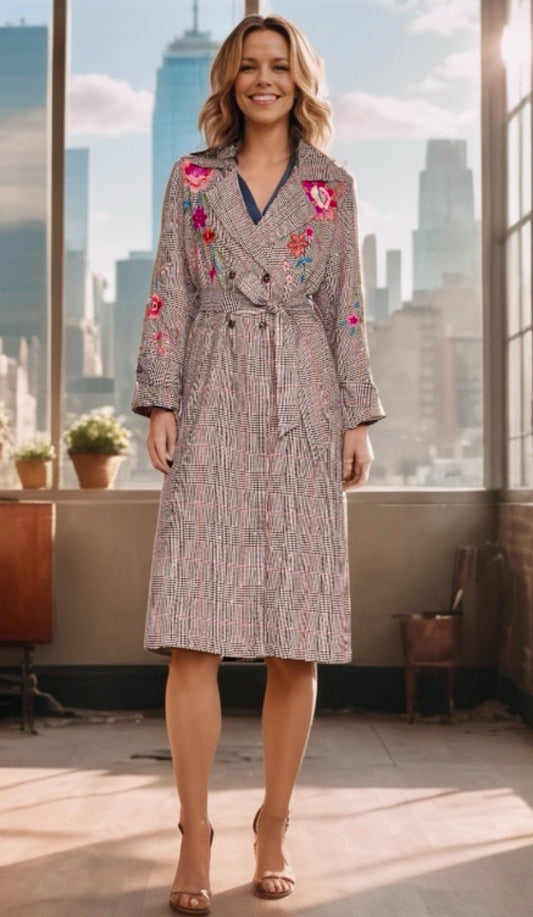 Johnny Was L Tan Plaid Trench Coat Jacket Silk Lining Sequin Accents $645