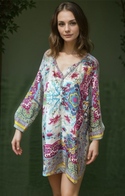Johnny Was XL 100% Silk Tunic Top Cool Blouse Button Up BOHO Shirt Floral