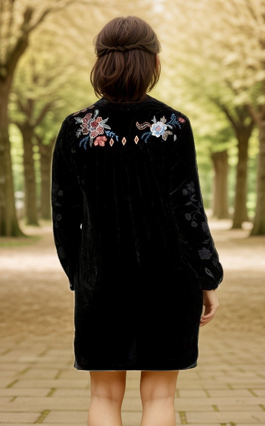 Johnny Was L Large Black Velvet Mini Shift Dress Or Tunic Top Embroidered