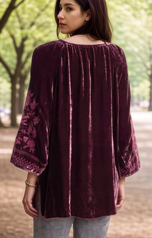 Johnny Was L Burgundy Wine Red Velvet Peasant Blouse Embroidered Tunic Top