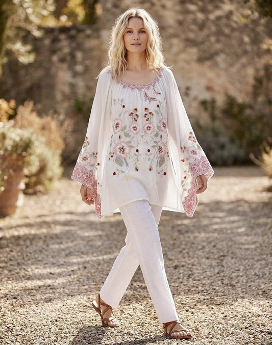 Johnny Was 2X / 3X Plus White Tunic Top Blouse Embroidered Silky Kimono Sleeves