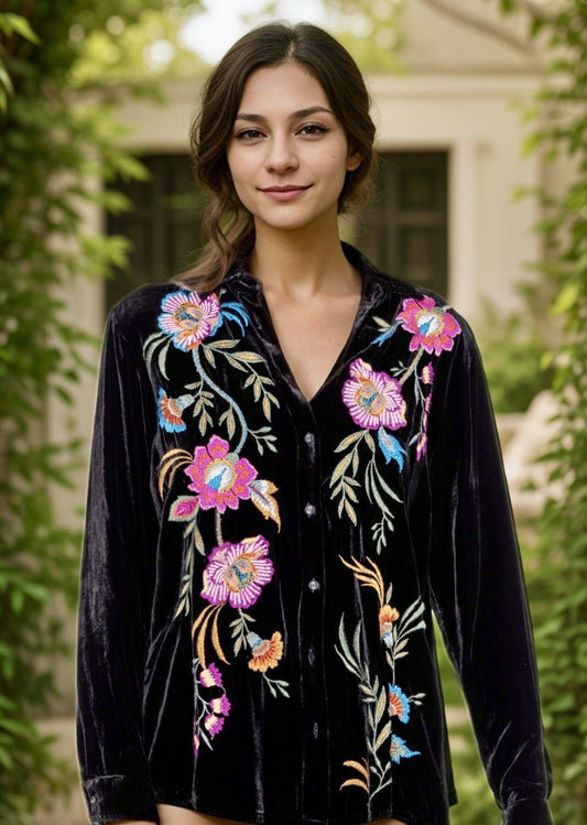 Johnny Was 3X 3XL Plus Black Velvet Long Sleeve Button Up Top Blouse Shirt