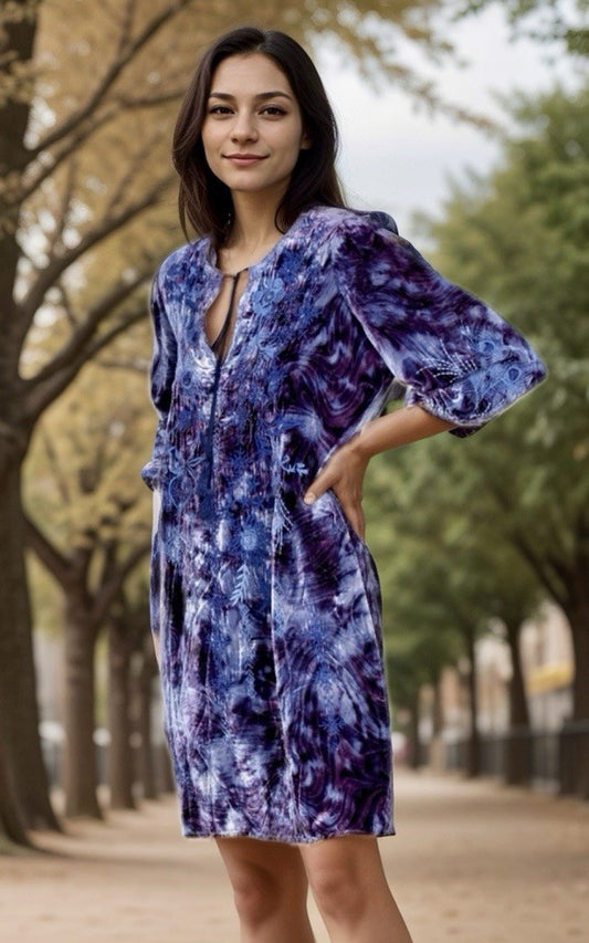Johnny Was 1X Plus Purple Velvet Mini Shift Dress Feather Embroidered Tunic