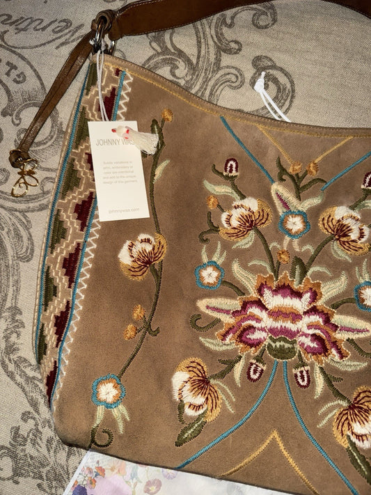 Johnny Was Brown Suede & Leather Bag Purse Tote Hobo Embroidered *READ*