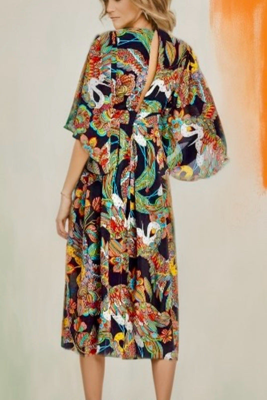 Johnny Was L Large Midi Dress Long Flowy Colorful Kimono Sleeves BOHO