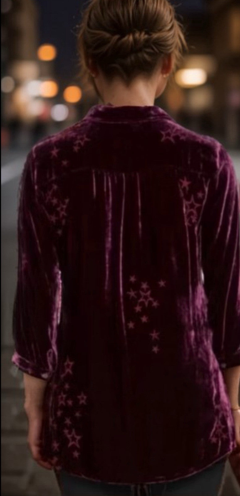 Elevate your wardrobe with this stunning velvet tunic top from Johnny Was. This designer piece features intricate embroidery accents, a button-up peplum baby doll style, and an open back. The dark wine red color is perfect for any occasion and the celestial theme adds a bohemian twist.
