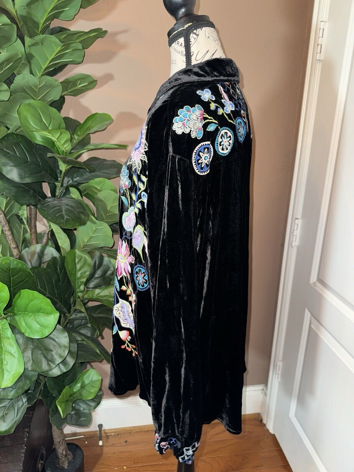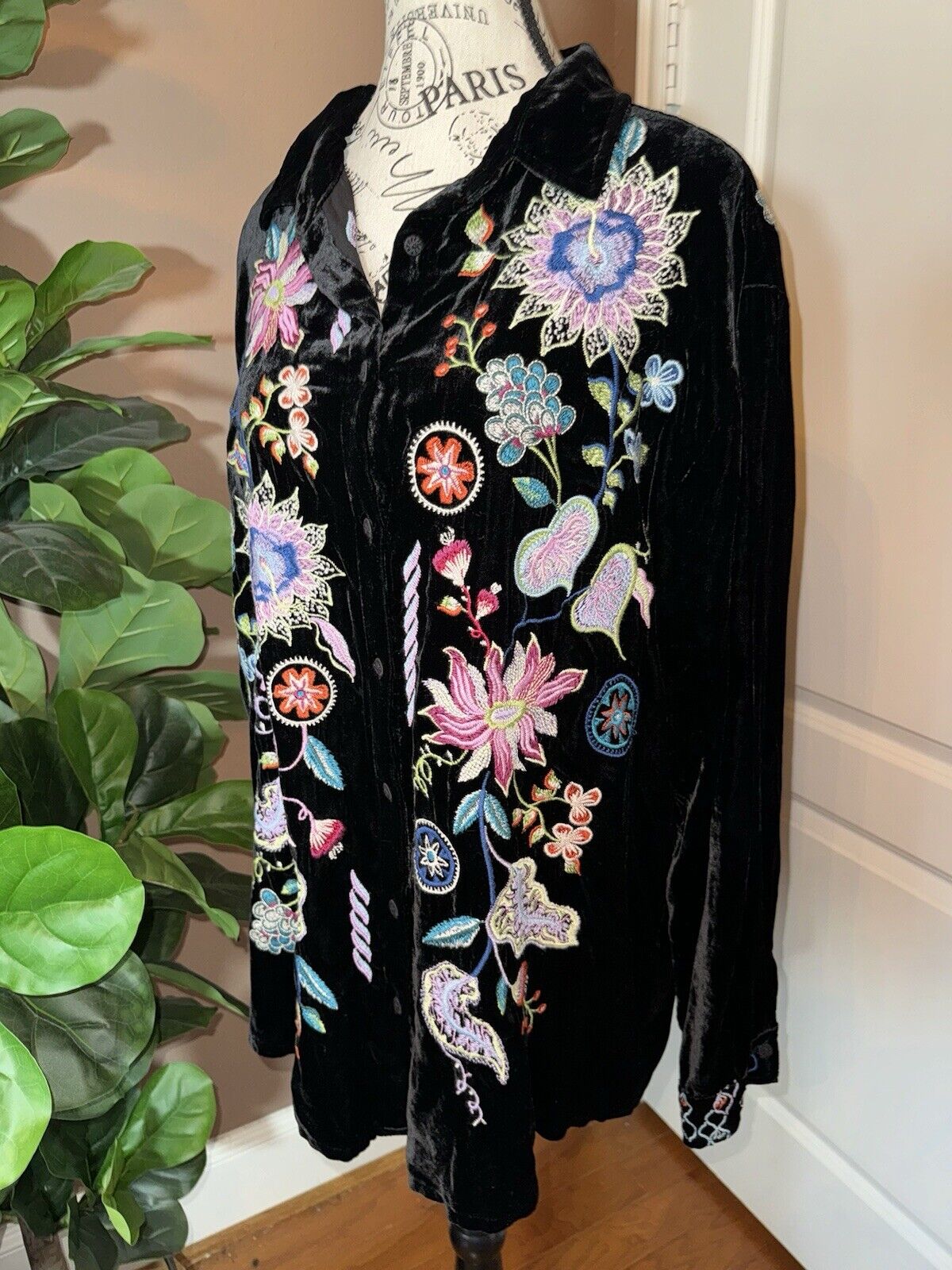 Johnny Was XL Velvet Black Long Sleeve Button Up Shirt Embroidered Top