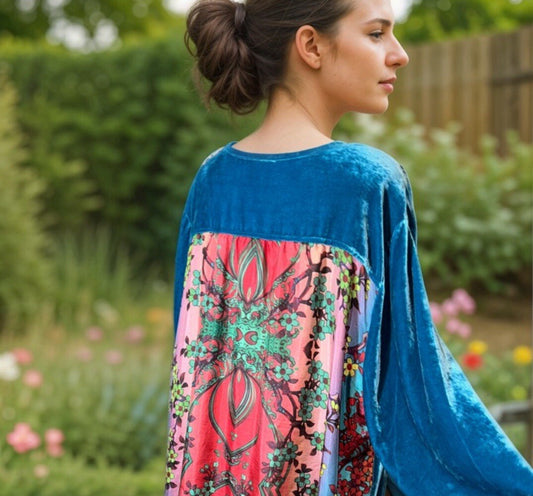 2 pc Johnny Was Large Teal Blue Velvet & Silk Tunic Top FREE Matching Undershirt