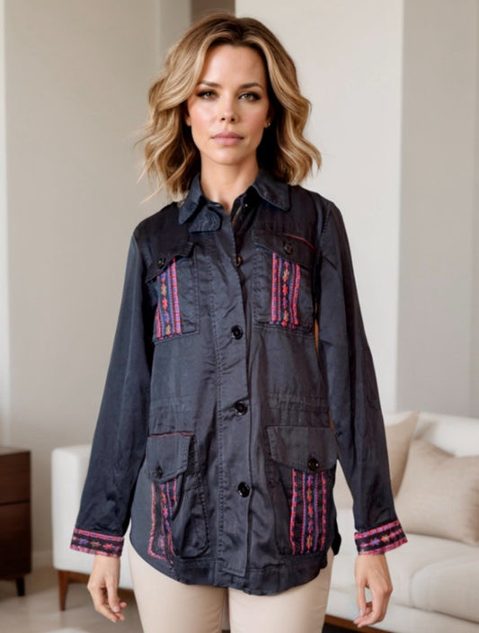 Johnny Was M Medium Black Military Field Jacket Pea Coat Anorak Embroidered BOHO