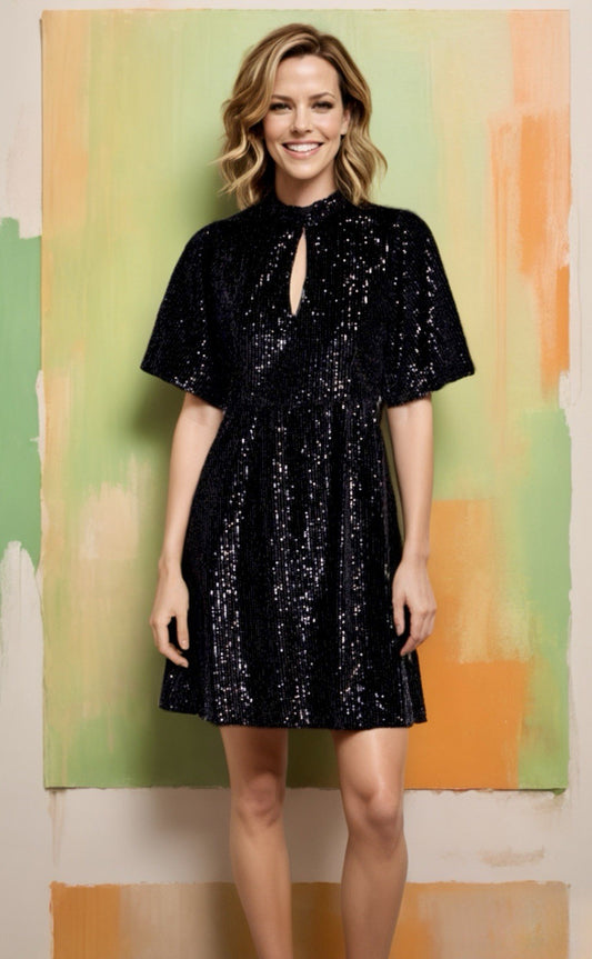 Johnny Was Sz 12 Black Sequin Party Dress Luxe Cocktail Mesh Slip Sequins